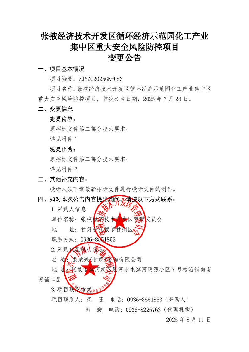 张掖经济技术开发区循环经济示范园化工产业集中区重大安全风险防控项目招标公告 变更公告